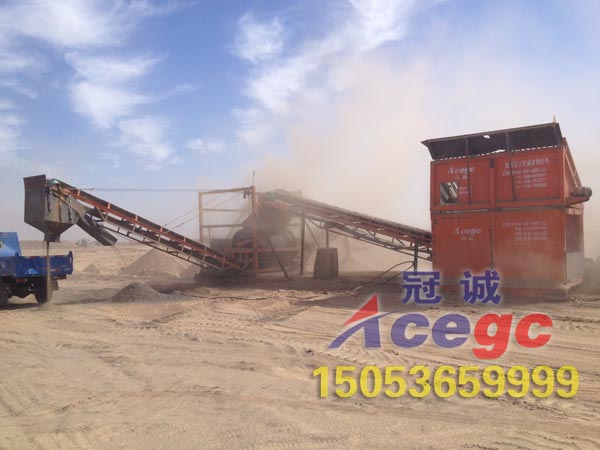 臥式干選機分兩種,一種是帶尾料輸送桿的,采用一臺裝載機上料,廢料用尾料輸送桿輸送出去,使用于4米左右沙層,上料高度為3.7米,裝載機可以直接上料不用助坡。另外一種是不帶尾料輸送帶,尾料用裝載機清除走,整機要用兩臺裝載機,上料高度為3.7米,裝載機可以直接上料不用助坡。整機用電45kw.2